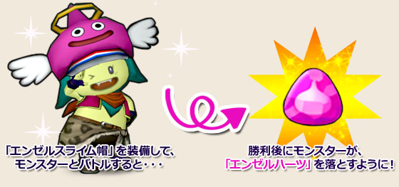パーティ内に「エンゼルスライム帽」を装備している職業レベル40未満のキャラクターがいると、戦闘勝利時にモンスターが「エンゼルハーツ」を落とすことがあります。装備しているパーティメンバーは、サポート仲間でもOKです。