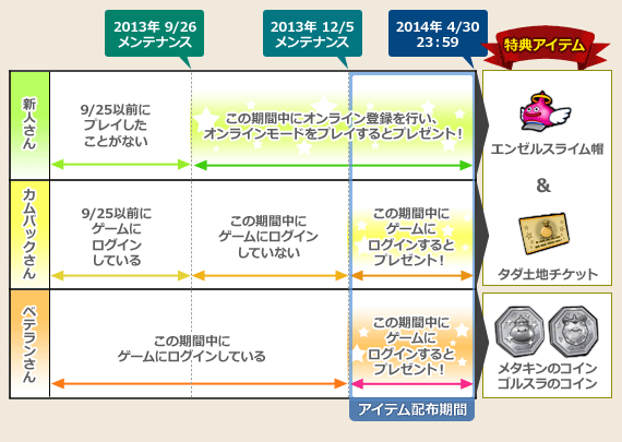 「新人さん&カムバックさん応援キャンペーン」および「ベテランさんありがとうキャンペーン」の対象は、ドラゴンクエストXのプレイ開始時期によって異なります。