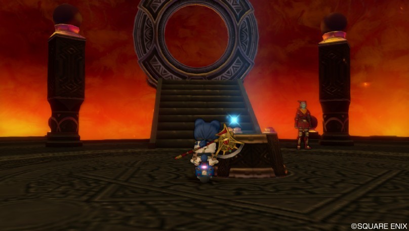 現地へ行くと、台座があるので、タゲって調べて、炎の解錠の円盤をはめ込見ます。