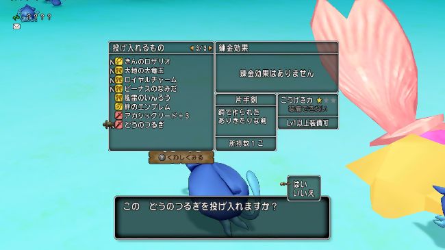 その銅の剣を右に見えるピンクの貝に投げ入れます